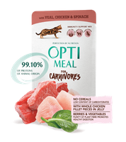 OPTIMEAL KOT sasz.85g CARNIVORES CIELĘ, KURA, SZPINAK w sosie /12